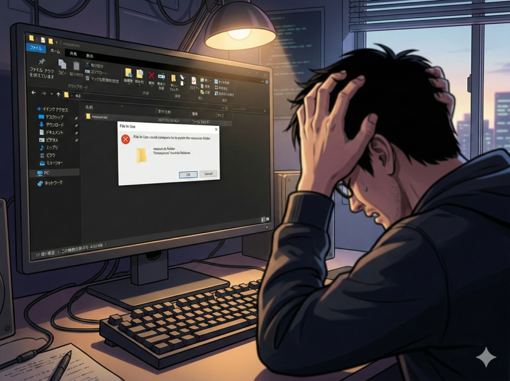 アンインストール、再起動、そして再インストール。定石を尽くした私を待っていたのは、実体のない幽霊だった。 削除しようとしても、名前を変えようとしても、Windowsが冷たく告げる。 「別のプログラムがこのフォルダーを開いているため、操作を完了できません」 犯人の名は『resources』。再起動しても、誰の手も借りずに自立してそこに居座り続ける、まさに「ゾンビ・フォルダ」。深夜4時半、エンジニア(エセ)の精神力は限界を迎えようとしていた。